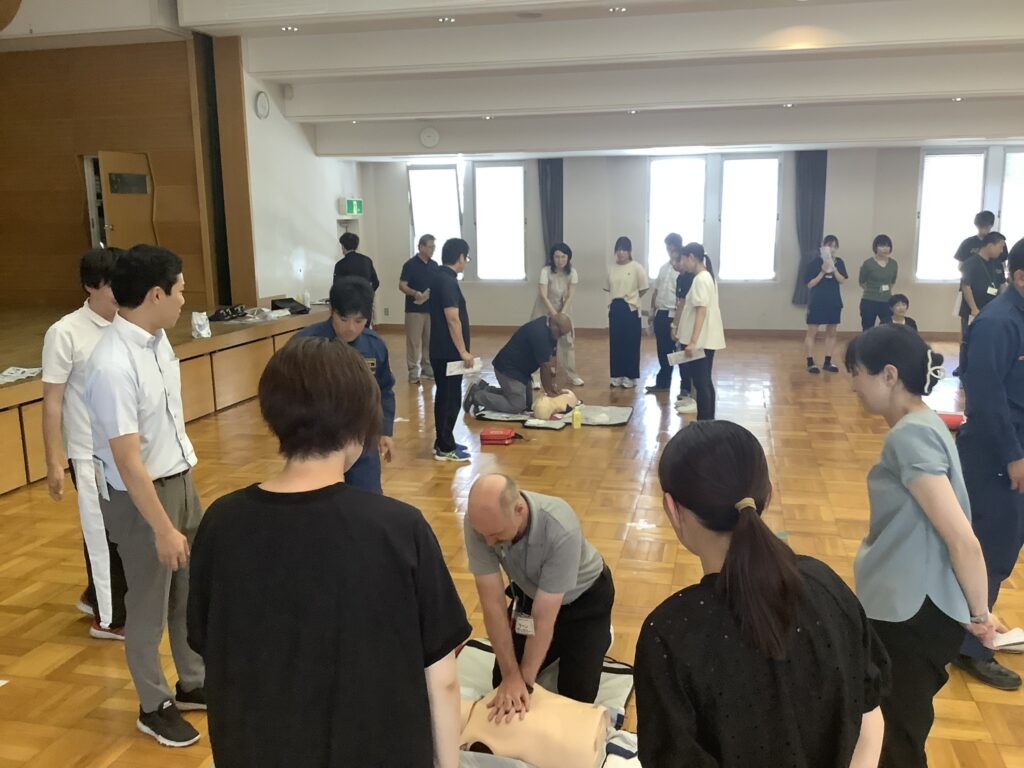本日は職員研修でAEDの使い方、心肺蘇生、人工呼吸について学びました。